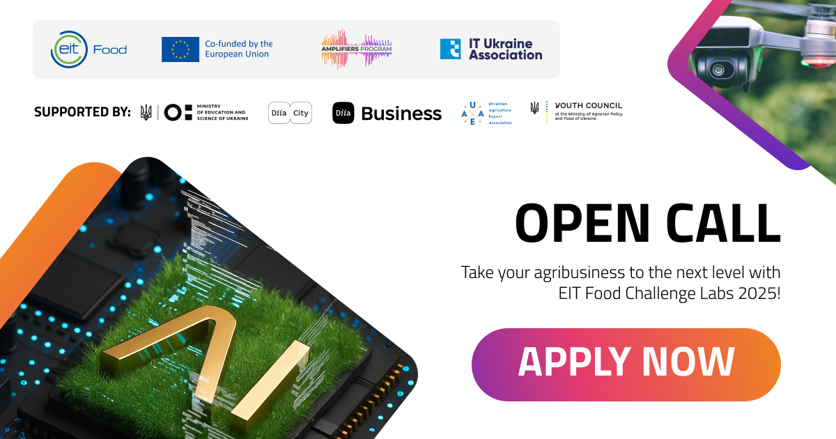 EIT Food Challenge Labs 2025 is implemented on the initiative of EIT Food. The project is implemented by the Amplifiers Program in partnership with IT Ukraine Association, with the support of the Ministry of Education and Science of Ukraine, Diia.City, national project Diia.Business, the Ukrainian Agrarian Export Association, Youth Council at the Ministry of Agrarian Policy and Food of Ukraine.