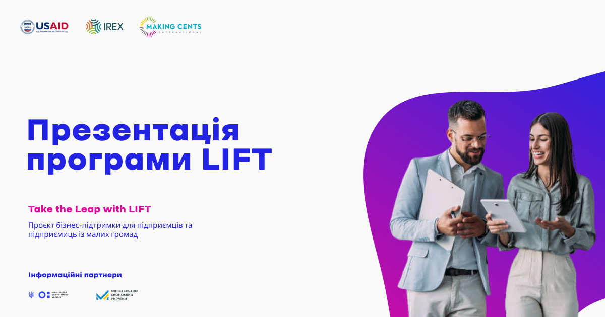 Програма LIFT — це унікальна можливість розвинути та масштабувати свою справу, а також отримати грантове фінансування у розмірі 10 000 доларів США на реалізацію затвердженого бізнес-проєкту та досягнення бізнес-цілей.